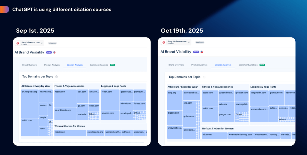 Dữ liệu của Similarweb cho thấy các mẫu trích dẫn của ChatGPT đang thay đổi nhanh chóng. Vài tháng trước, Wikipedia và Reddit thống trị các nguồn mà nó tham chiếu. Ngày nay, công cụ theo dõi AI Brand Visibility của chúng tôi cho thấy thị phần của chúng đang giảm khi ChatGPT bắt đầu lấy từ một loạt các loại nội dung đa dạng hơn.