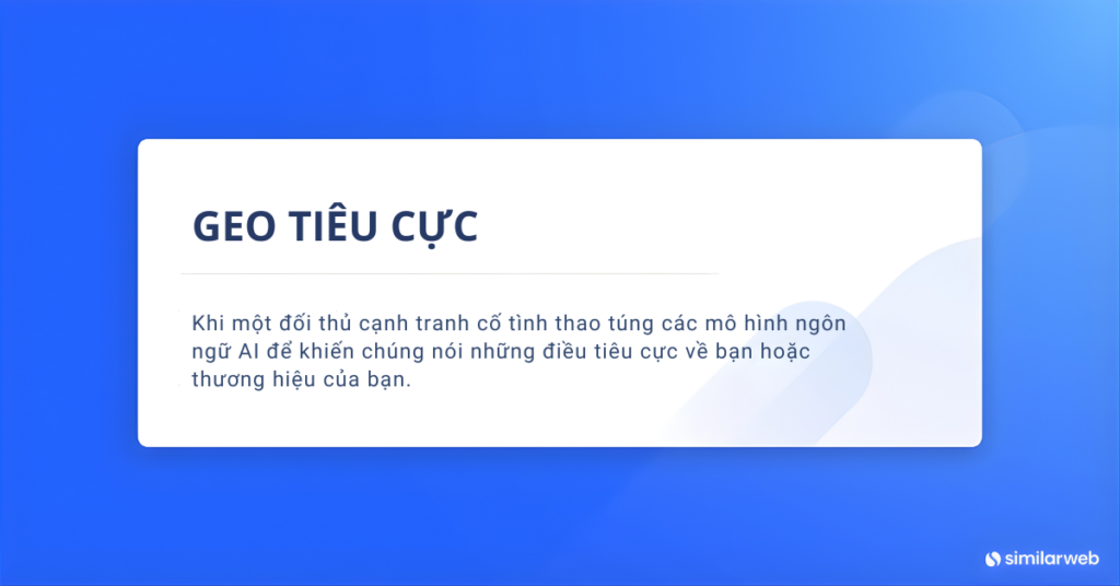 SEO tiêu cực là về việc làm tổn hại đến thứ hạng và lưu lượng truy cập tự nhiên của bạn. GEO Tiêu cực là về việc kiểm soát câu chuyện. Thiệt hại nằm ở nhận thức, không chỉ là khả năng hiển thị.