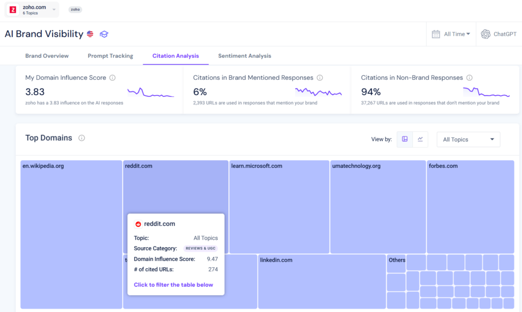 Những trang web và nguồn nào mà các mô hình AI tham chiếu khi chúng nói về bạn? Công cụ Citation Analysis của Similarweb trả lời điều này bằng cách hiển thị các tên miền định hình các câu trả lời của AI.