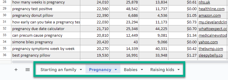Kết quả là một danh sách từ khóa lớn chưa được lọc. Xuất danh sách này vào một trang tính Google và thực hiện tương tự cho tất cả các chủ đề khác bạn thấy trên trang web. Trong trường hợp của parenting.com, sau khi tôi đã xuất các từ khóa về nuôi dạy con cái, tôi vẫn phải tìm từ khóa cho: