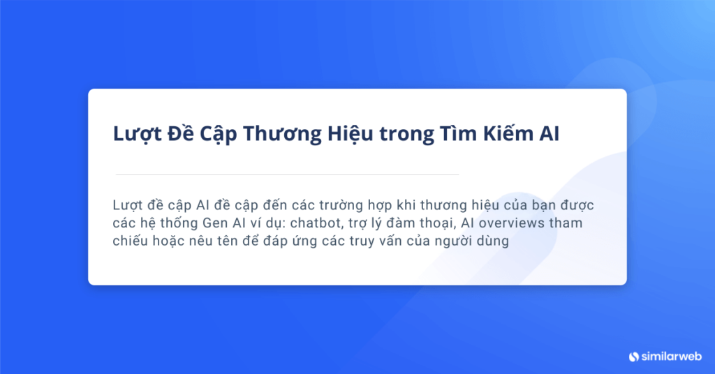 Lượt đề cập AI đề cập đến các trường hợp khi thương hiệu của bạn được các hệ thống Gen AI ví dụ: chatbot, trợ lý đàm thoại, AI overviews tham chiếu hoặc nêu tên để đáp ứng các truy vấn của người dùng. Những lượt đề cập này có thể là rõ ràng (tên thương hiệu của bạn xuất hiện) hoặc ngầm định (thương hiệu của bạn được mô tả mà không được nêu tên, hoặc nội dung của thương hiệu bạn được sử dụng làm nguồn).