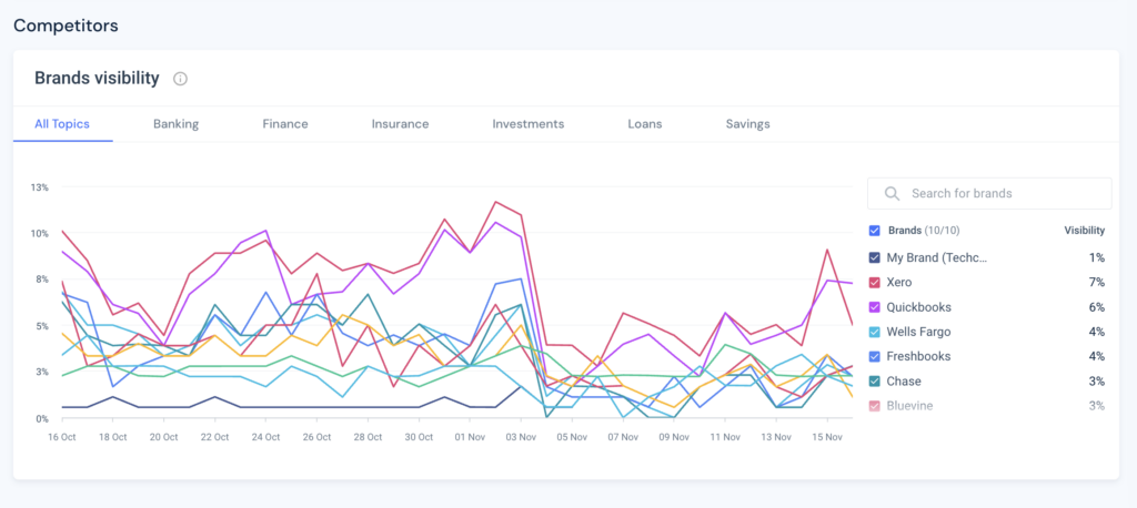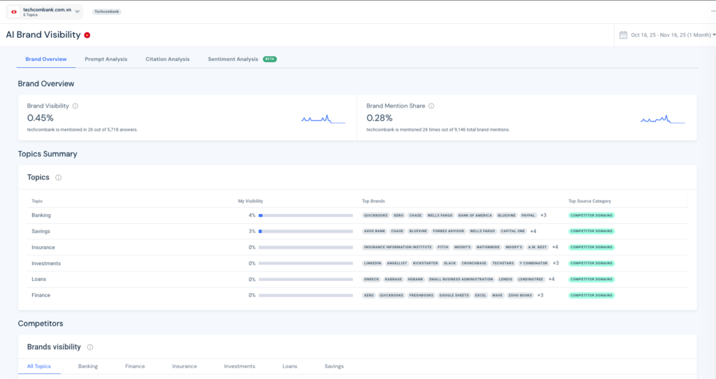 - Tổng quan thương hiệu: Các chủ đề chính & khả năng hiển thị của đối thủ cạnh tranh