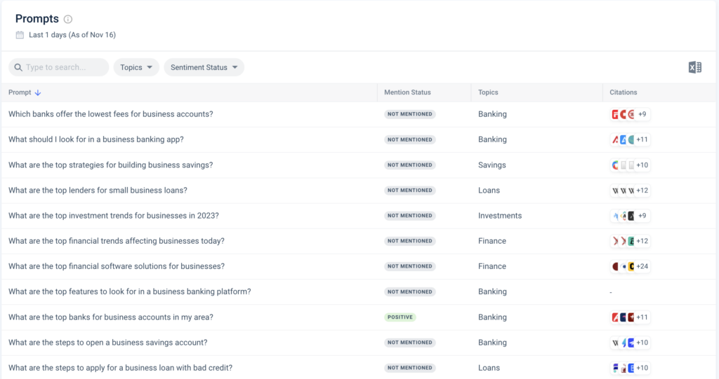 - Tín hiệu chiến lược nội dung: Những chủ đề nào dẫn đến việc thương hiệu của bạn được đề cập? Những câu lệnh nào kích hoạt khả năng hiển thị của thương hiệu bạn?