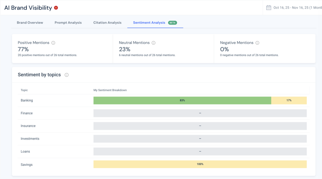 Công cụ AI Brand Visibility của chúng tôi cho phép bạn thiết lập các chiến dịch theo dõi tần suất và trong bối cảnh nào các trợ lý AI tham chiếu đến thương hiệu của bạn.