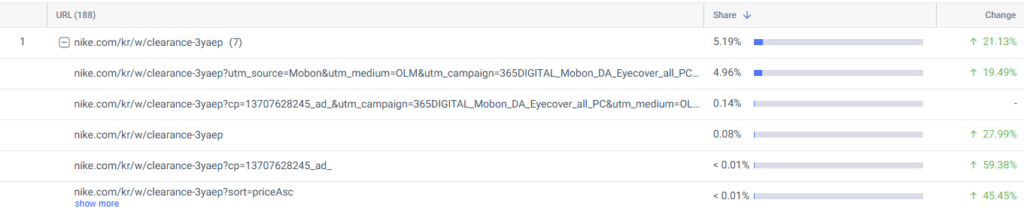 Bằng cách phân tích traffic từ các quốc gia và ngôn ngữ khác nhau, các tập đoàn có thể xác định cách các thị trường mục tiêu khác nhau tương tác với trang web và sản phẩm của họ. Ví dụ, hãy xem các thư mục ngôn ngữ hàng đầu của nike.com được sắp xếp theo thị phần. Trang web tiếng Hàn của họ chiếm hơn 13% thị phần, trong khi URL cửa hàng chính (nike.com/w) đứng thứ hai với 12% thị phần.