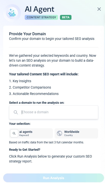 Mẹo chuyên nghiệp: Bạn có thể sử dụng tác nhân SEO AI của Similarweb: SEO Strategist. Tác nhân mới sẽ phân tích các từ khóa, tên miền và quốc gia bạn đã cung cấp để xây dựng báo cáo chiến lược nội dung. Nó sẽ nghiên cứu và phân tích web, và tìm các cơ hội chủ đề phù hợp nhất với bạn, cũng như ưu tiên chúng.