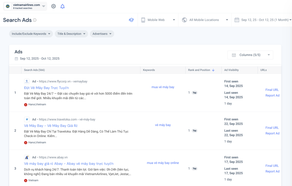 Công cụ Search Ads của Similarweb có thể cho bạn biết mọi thứ bạn cần biết về cách đối thủ của bạn đang marketing cho từng sản phẩm của họ. Bạn cũng có thể sử dụng công cụ Segment Analysis để đi sâu vào dữ liệu về hiệu suất của các sản phẩm đó và xem kênh marketing nào đang mang lại lưu lượng truy cập.