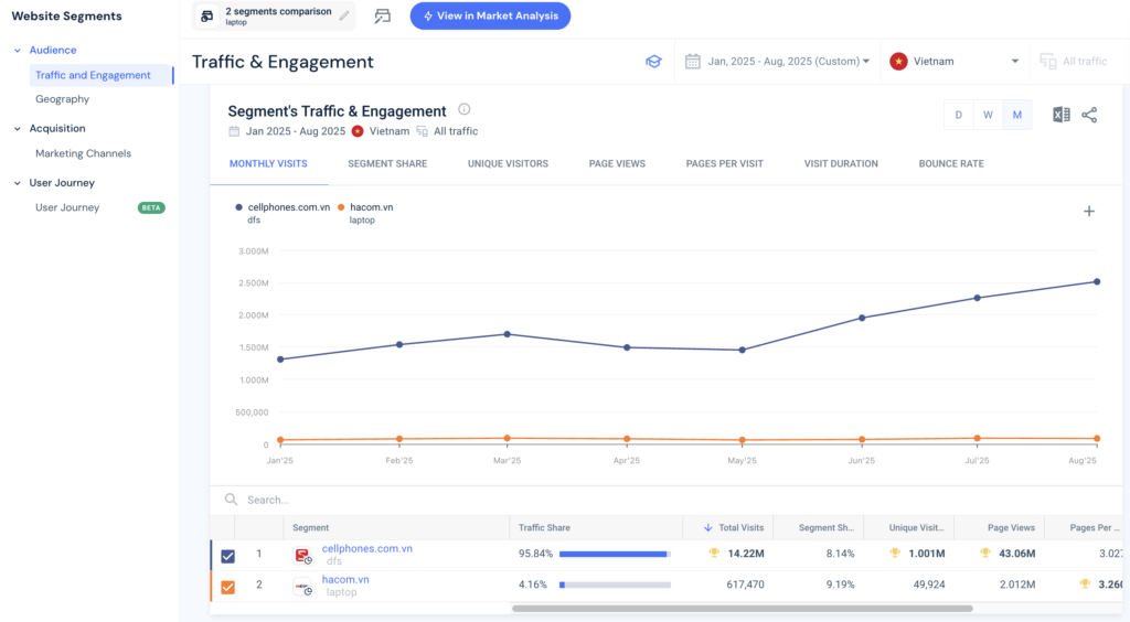 Hãy thực hiện phân tích đối thủ TMĐT, tối ưu hóa chiến lược marketing của bạn, nổi bật trong một ngành công nghiệp cạnh tranh và vượt qua tất cả các đối thủ chính của bạn. Nếu bạn muốn bỏ qua việc nghiên cứu thủ công và muốn có một nền tảng marketing tất cả trong một để làm việc khó cho bạn, Similarweb có thể là lựa chọn dành cho bạn.