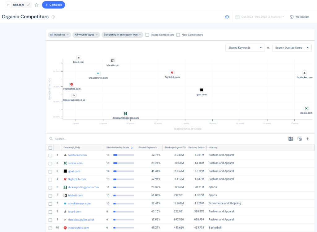 Để xác định các đối thủ TMĐT của bạn, bạn có thể tự nghiên cứu thủ công hoặc sử dụng các công cụ để làm việc này. Các công cụ như Organic Competitors của Similarweb có thể cung cấp cho bạn một cái nhìn đồ thị về các đối thủ chính của bạn về mặt tìm kiếm tự nhiên.