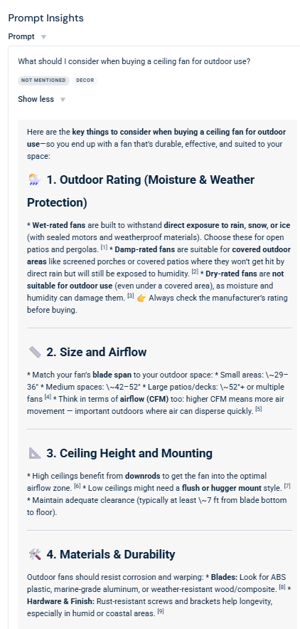 Khi tôi xem xét prompt về quạt trần ngoài trời, rõ ràng là AI đã dựa nhiều vào các tài nguyên chuyên gia, chi tiết. Home Depot không bị bỏ lỡ vì thiếu sản phẩm, mà là vì họ không có chiều sâu nội dung mà AI tin tưởng. Vì vậy, bước đầu tiên sẽ là tạo hoặc cải thiện nội dung trực tiếp trả lời các prompt có ý định cao này, tuân theo các nguyên tắc Tối ưu hóa Công cụ Trả lời (Answer Engine Optimization – AEO), một phần của xu hướng tối ưu cho công cụ AI tạo sinh.