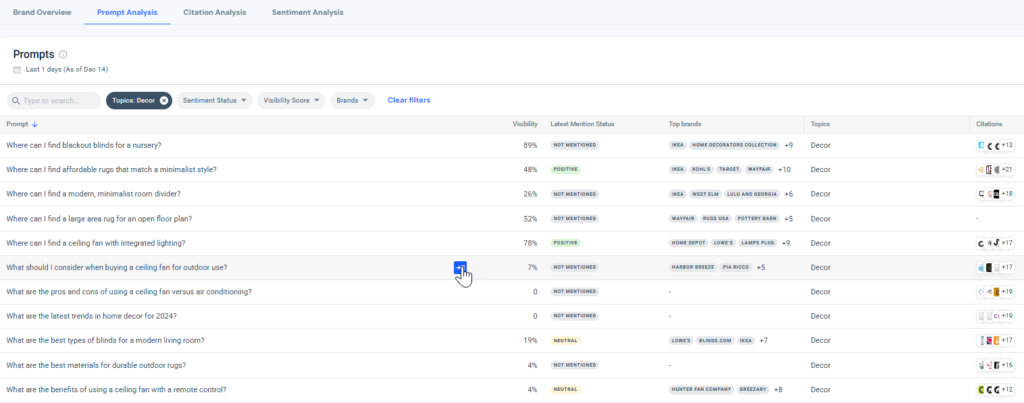 Sau khi tôi hiểu được điểm mạnh và điểm yếu theo chủ đề của Home Depot, tôi muốn tìm hiểu gần hơn về các câu hỏi thực tế mà mọi người đang hỏi AI. Tôi đã lọc các prompt trong danh mục “Trang trí”.