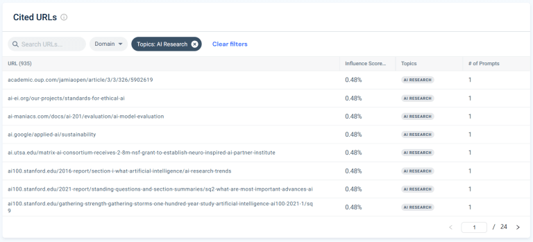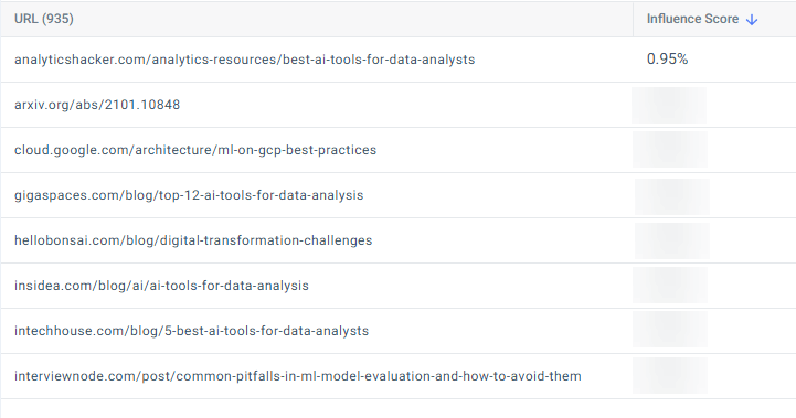 Bảng Cited URLs cung cấp insight chi tiết hơn nữa. Đây cũng là nơi bạn có thể xác định các khoảng trống trích dẫn: sắp xếp các tên miền theo điểm ảnh hưởng và so sánh danh sách của bạn với danh sách của đối thủ cạnh tranh.