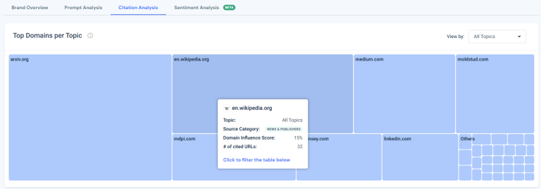 Tiếp theo, nhấp vào tab Citation Analysis. Báo cáo này cho thấy các tên miền và URL nào mà các công cụ tạo sinh trích dẫn khi đề cập đến thương hiệu của bạn.
