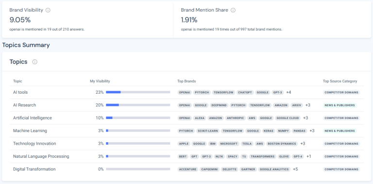 Tính năng này tiết lộ mức độ hiển thị của thương hiệu của bạn trong các câu trả lời do AI tạo ra cho các chủ đề bạn quan tâm nhất.