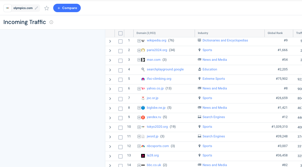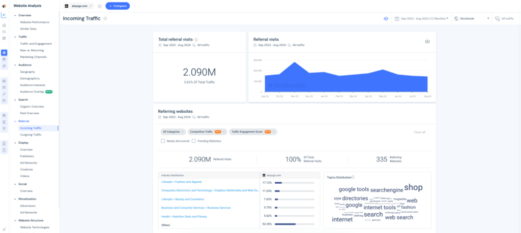 - Các công cụ referral marketing của Similarweb: Similarweb cung cấp những insight mạnh mẽ về referral traffic. Bạn có thể vào mục “Website Analysis” > “Referral” > “Incoming Traffic” để có được một bản phân tích chi tiết.