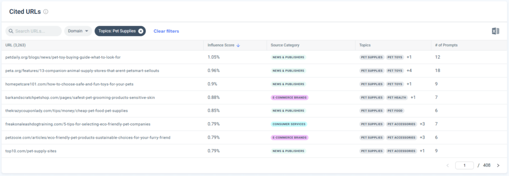 - Trong ví dụ của tôi, chúng ta có thể thấy petcare.com có 8% ảnh hưởng đến AI cho các chủ đề liên quan đến Chewy. Đây nên là một nguồn mà Chewy nên nhắm mục tiêu cho các mối quan hệ đối tác và tiếp thị nội dung.