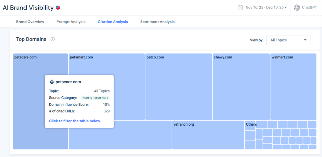 Bảng điều khiển phân tích trích dẫn AI cho thấy tên miền của chính thương hiệu chỉ chiếm một phần nhỏ trong các trích dẫn trong các phản hồi đề cập đến thương hiệu. Đồng thời, các đối thủ cạnh tranh và blog độc lập được trích dẫn thường xuyên hơn. Điều này không phải là duy nhất đối với Chewy.
