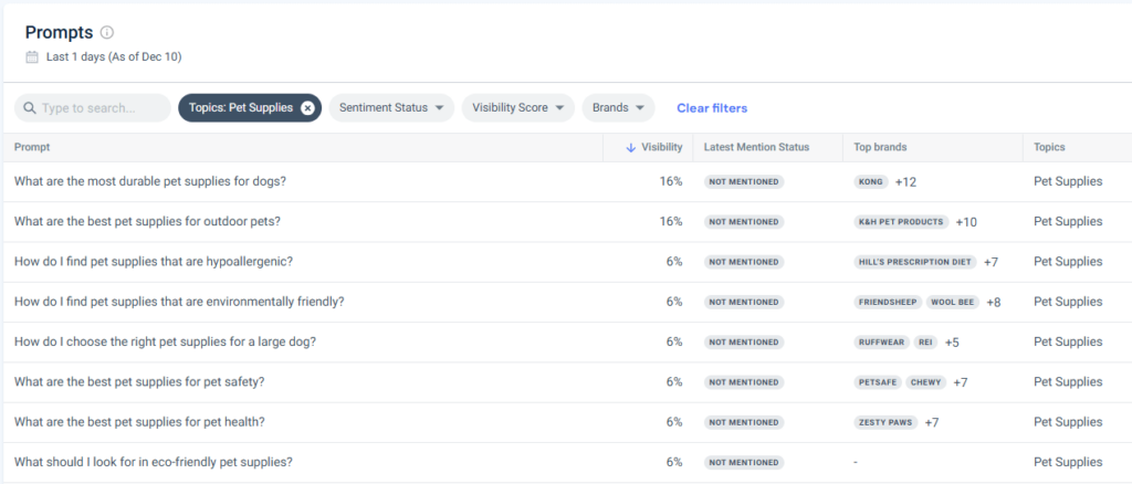 - Ví dụ, đối với prompt “Đồ dùng thú cưng tốt nhất cho sức khỏe thú cưng là gì?”, Chewy đã được đề cập, nhưng Zesty Paws là thương hiệu hàng đầu, với khả năng hiển thị cao nhất.