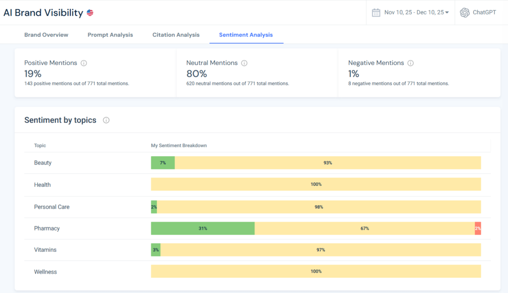 Mặc dù trung lập là chấp nhận được, việc tăng cường tâm lý tích cực thông qua nội dung hữu ích và sự ủng hộ của khách hàng có thể cải thiện giọng điệu của các câu trả lời AI và nhận thức về thương hiệu.